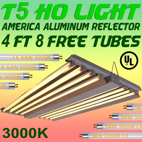 8 Lamp 4Ft T5, UL Certificate. High Output! 40,000 lumens! Perfect for indoor or undercover using. Built-in durable full-voltage digital ballast for stable light output effect. Can adjust voltage from 120 volts (household) to 277 volts automatically! 3000K color temperature fluorescent tubes provide orange or red spectrum, especially good for the flowering, budding or fruiting stages of plant. It's like the light spectrum of sunlight in late autumn to promote plants flower or fruit. Durable Steel Construction with American Aluminum Reflector and white stoving varnish surface. American aluminum mirror reflector offers 95% reflectivity & super diffusion. The higher reflectivity of reflector, the stronger intensity of light. Higher efficient than other ordinary rough aluminum or metal reflector. Can keep the excellent reflective effect and hardly stick fingerprint on. You can wipe it with clean rag if needed. Much safer! Advanced open-type reflector design and Louvers make the ballast and light tubes cool. Specifications: Power Supply 120-277V(with US standard plug), 50-60Hz Actinic Tubes 8 tubes Power 8x 54watts (total 432w) Illumination 8x 5,000Lux (total about 40,000Lux) Color Temperature 3000K Overall Size(w/ hooks) 48" L x 25-1/2" W x 6" H Power Cord Length 10-1/4 feet Package Includes: 1x 4Ft T5 Grow Light Panel 8x 3000K T5 Light Tubes 2x Steel Hooks 1x Manual for General T5 Light Model