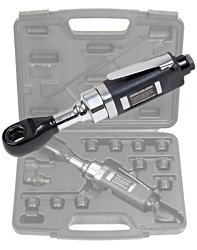 Aircraft Tool Supply, Compact Thru-Hole Ratchet Wrench Set is the perfect tool to install and remove nuts from studs and long bolts. Included drive head adapters so that it can also be used as a normal Air Ratchet. * Includes Square Drive Adapters for use with standard 1/4" and 3/8" drive sockets. * Includes thru-hole sockets in sizes: 5/16", 3/8", 7/16", 1/2", 9/16", 8mm, 10mm, 12mm, 13mm, 14mm * Max Torque: 30 ft-lbs * Free Speed 450 rpm * Length 8.25" * 1/4" NPT air inlet * 90 psi operation * Includes molded case