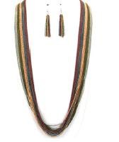 36 Inch Long, This captivating long multiple strand metalic chain necklace and matching earring set will set you apart from the crowd. This chain-mail designed necklace is 36 inches long, is comprised of 2 strands each of silver, antiqued, black, copper and goldtone metalic chain (a total of 10 strands) which are secured by a single lobster claw closure. The set is completed by 2.5 inch long chain earrings hanging from fish hook ear wire. Your necklace and earring set will be shipped to you in a gift box for easy gift giving.